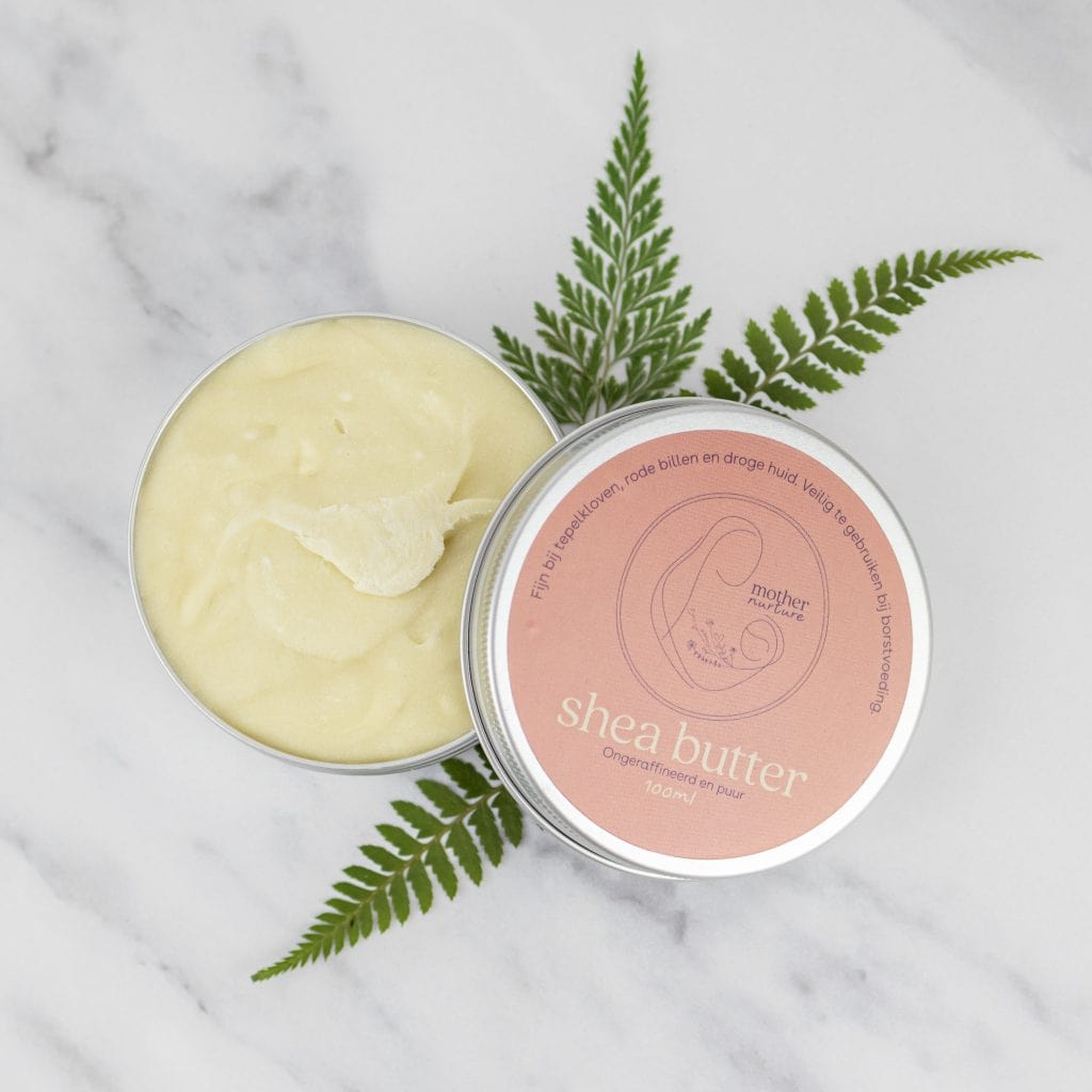 De meest veelzijdige en 100% natuurlijke lichaamsboter van Mother Nurture. Deze boter helpt goed bij tepelkloven en stimuleert het herstel van (genezen) hechtingen of rode babybillen. Shea butter bevat vitamine A, D, E en F en wordt via je huid opgenomen. Shea butter kun je op ieder lichaamsdeel gebruiken, lekker duurzaam en multifunctioneel! Je kunt het zelfs gebruiken als lippenbalsem, massagecréme of aftersun.